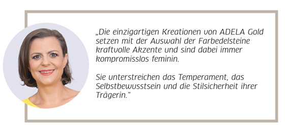 Die einzigartigen Kreationen von ADELA Gold setzen mit der Auswahl der Farbedelsteine kraftvolle Akzente und sind dabei immer kompromisslos feminin. Sie unterstreichen das Temperament, das Selbstbewusstsein und die Stilsicherheit ihrer Trägerin.