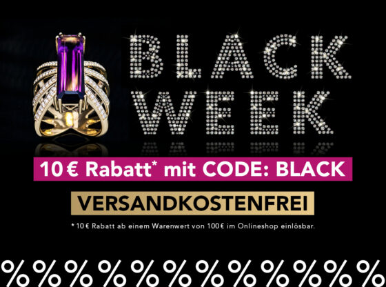 Im Onlineshop geben Sie einfach den Code BLACK ein. Sie erhalten auch auf bereits reduzierte Artikel im Sale Rabatt! Nutzen Sie die Gelegenheit auf echten Edelsteinschmuck und Accessoires zu echten BLACK WEEK-Preisen.