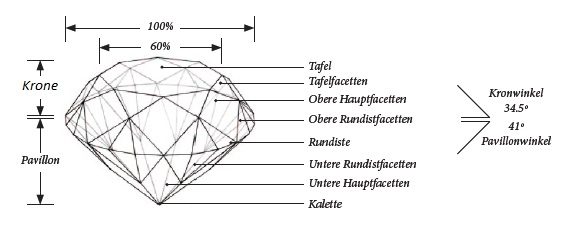 Der Brillantschliff hat 57 Facetten, zählt man die Kalette hinzu, sind es 58. Er besitzt eine kreisrunde Tafel, 32 Facetten oberhalb der Rundiste und 24 unterhalb dieser. Die idealen Winkel liegen bei 34,5° für die Krone und bei 41° für den Pavillonwinkel.