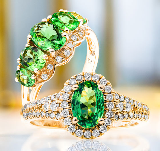 - Grossular: Der seltene Tsavorit ist ein leuchtend grüner Granat der Grossular-Gruppe, der vor rund 50 Jahren entdeckt wurde. Der Stein wurde nach seinem ersten Fundort, dem Tsavo-Nationalpark im Süden Kenias, benannt. Seine Farbe erhält er durch Chrom und Vanadium.
