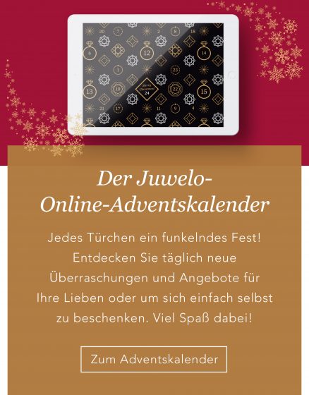 Bis zum 24. Dezember öffnen wir jeden Tag ein Türchen im Juwelo-Adventskalender. Pünktlich um 17 Uhr wird ein besonderes Schmuckstück oder Accessoire live im TV präsentiert. Und wer es nicht erwarten kann, der kann bereits um Mitternacht am Vortag bei Juwelo vorbeischauen, denn da wird das nächste Türchen schon geöffnet und das Geheimnis gelüftet! Auch online wartet ein Adventskalender mit 24 tollen Aktionen und Überraschungen auf Sie. Also: Schauen Sie täglich bei Juwelo vorbei – Im TV und online.