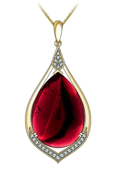 Dieser AAA-Cruzeiro-Rubellit-Goldanhänger mit einem Gewicht von über 20 Karat wurde als tropfenförmiger Cabochon geschliffen. Ein Schmuckstück der Extraklasse, das seiner Trägerin ein Leben lang viel Freude bereiten wird!