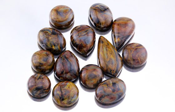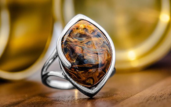 Goldener Pietersit in dieser Form ist bisher nur aus Namibia bekannt. Lange dachte man, dass das Mineral Pietersit nur in Afrika gefunden werden kann, 1993 hat man dann allerdings ähnliches Material in der Provinz Hunan in China gefunden. Dieser zeigt aber einige mineralogische Abweichungen und ist eher rötlich. Die chinesische Mine scheint allerdings auch bereits wieder geschlossen zu sein. Auch in Namibia werden keine großen Funde mehr getätigt. Daher ist der Goldene Pietersit ein eher unbekannter Edelstein geblieben, der nicht ständig verfügbar ist, dafür aber großes Sammlerpotential besitzt. Umso mehr freuen wir uns Ihnen endlich diese neue Kollektion vorstellen zu können, denn genügend Steine für eine ganze Kollektion zusammenzutragen, war eine echte Herausforderung!