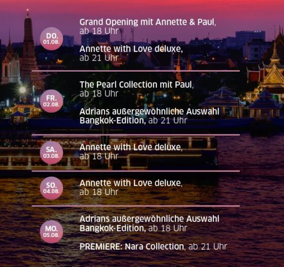 Tauchen Sie zusammen mit Annette, Paul und Adrian ein in eine Welt luxuriöser Extravaganz. Gleich in den ersten Tagen des Augusts starten wir etwas völlig Neues: Wir haben in Bangkok ein kleines Studio aufgebaut, aus dem wir Ihnen die Chance auf einmalige Schmuck-Gelegenheiten geben wollen.