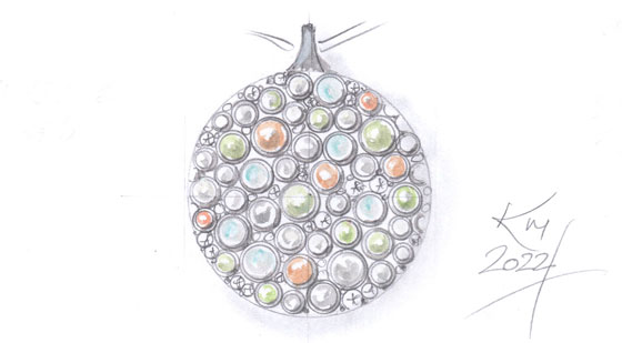 KM„Edelsteine üben auf mich eine große Faszination aus, Die Vielfalt der Farben, Transparenz, Brillanz aber auch die Lichtspiele einzelner Edelsteine bieten mir eine umfangreiche gestalterische Bandbreite. Gerade Cabochons geben mir die Möglichkeit großflächig und außergewöhnlich zu arbeiten. Aber auch Akzente durch facettierte Steine zu setzen, hat seinen Reiz. Wie z. B. das Spannungsverhältnis, dass man durch die Farben, die Transparenz im Kontrast zu opaken Steinen setzen kann.