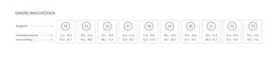Bei der Umrechnung von Umfang zu Durchmesser hilft Ihnen unsere Umrechnungstabelle auf der Webseite. Hier sind auch die gängigsten Maße verschiedener Länder angegeben, denn die Bestimmung von Ringgrößen wird global sehr unterschiedlich gehandhabt.